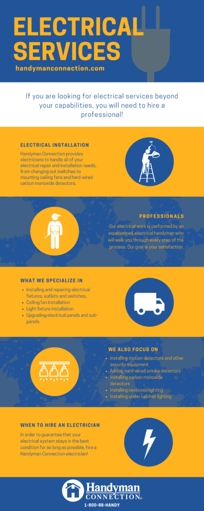 No matter what electrical project you have on your to-do list, Handyman Connection is your local go-to for electrical handyman services. With over 25 years of experience serving locations in both the United States and Canada, our seasoned craftsmen offer the top-notch workmanship your home deserves. Call 1-800-88-HANDY to get started, or find a location near you.